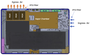 The AirJet Mini generates 1750 Pascals of suction, or back pressure, ensuring air flow into and out from product enclosures. This movement of air inside the Tablet helps keep the skin temperatures low.