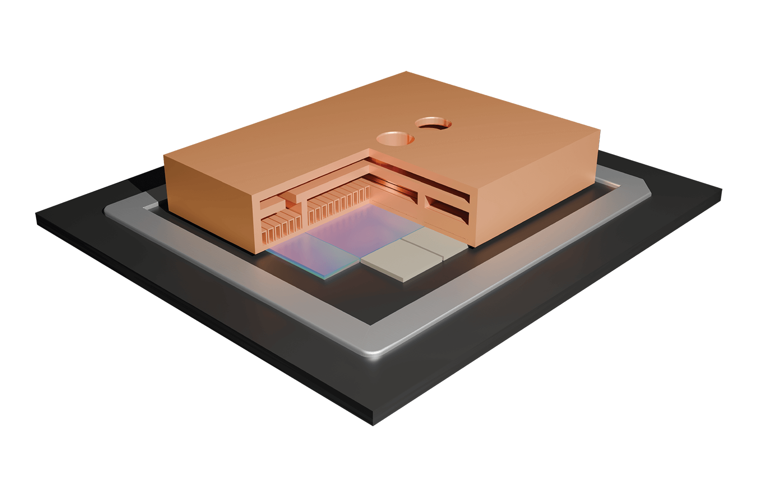 不同于对为低功耗、均匀热分布设计的传统冷板进⾏适应性改造,Frore Systems 将半导体级制造技术应⽤于这⼀突破性散热解决⽅案。通过⾦属晶圆、3D 短回路喷射通道微结构、多级冷却架构以及混合3D 单元结构, LiquidJet 能够精准匹配当前GPU 的实际热分布图谱,⽽⾮仅仅针对其平均功 耗⽔平。