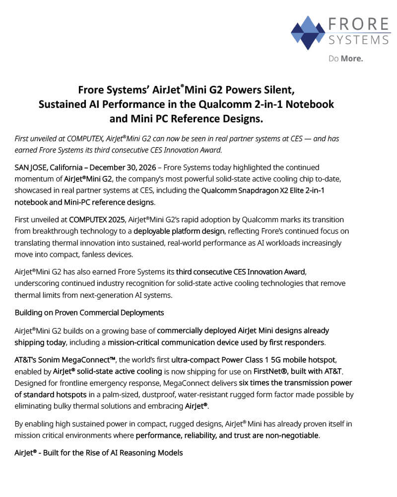 美国加利福尼亚州圣何塞 – 2026 年 12 月 29 日 —— Frore Systems 今日重点展示了其迄今为止性能最强劲的固态主动散热芯片——AirJet®Mini G2 的强劲发展势头。该产品已在 CES 的合作伙伴实机系统中展出,其中包括 Qualcomm Snapdragon X2 Elite 二合一笔记本及迷你电脑(Mini-PC)参考设计。