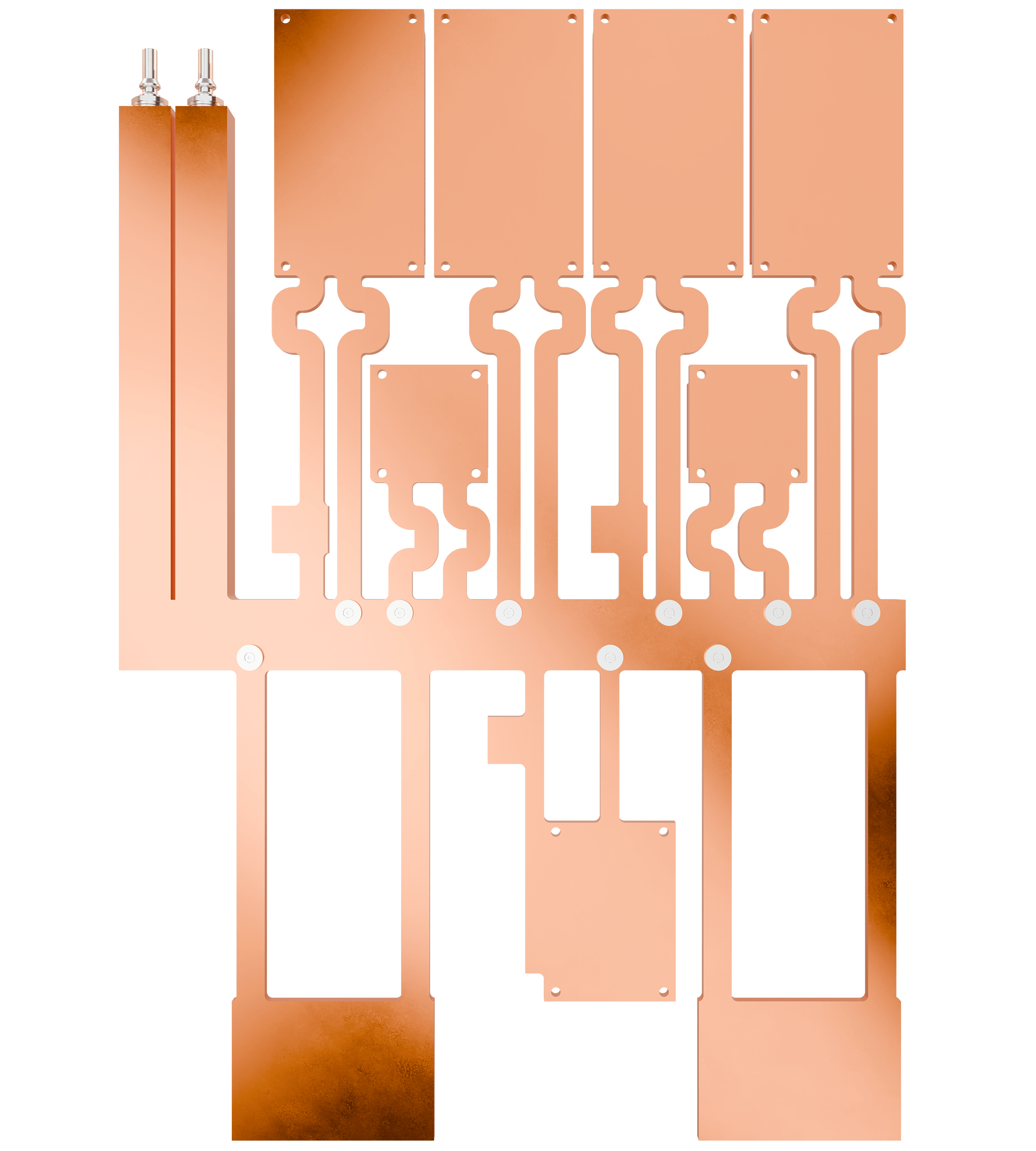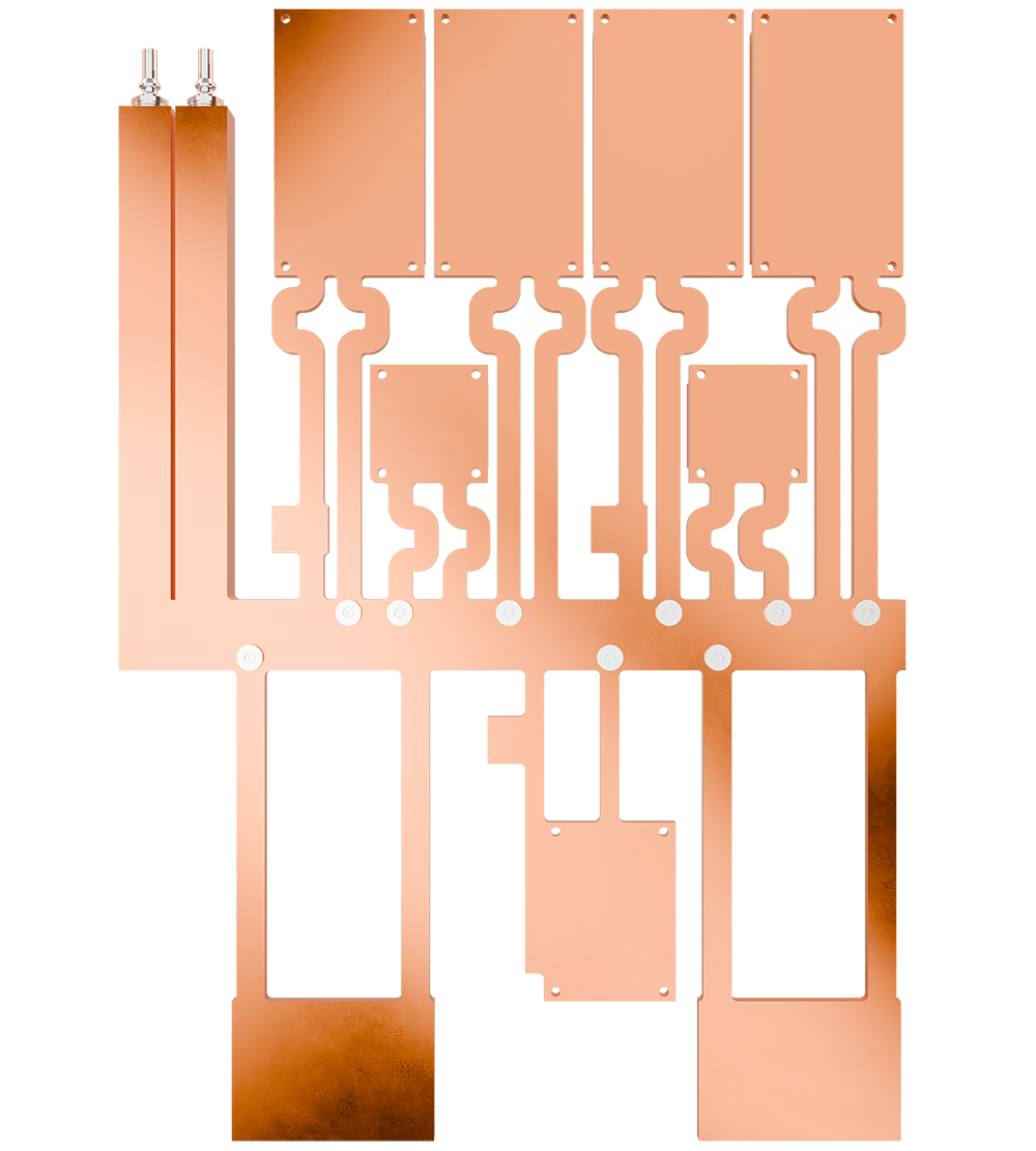 LiquidJet Nexus 专为 ½U 计算托盘(compute trays) 的液冷需求设计,例如 NVIDIA Kyber 等新一代 AI 服务器系统。该方案能够对 GPU、CPU、DPU、NIC、DC-DC 电源转换器以及电压调节器(VR) 等关键组件进行直接液冷散热。系统通过整合多个 多级三维短回路喷射通道(multi-stage 3D short-loop jetchannel)LiquidJet 冷板,构建成统一的一体化散热系统。
