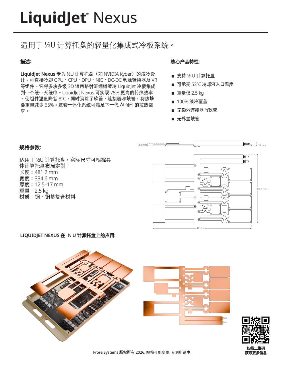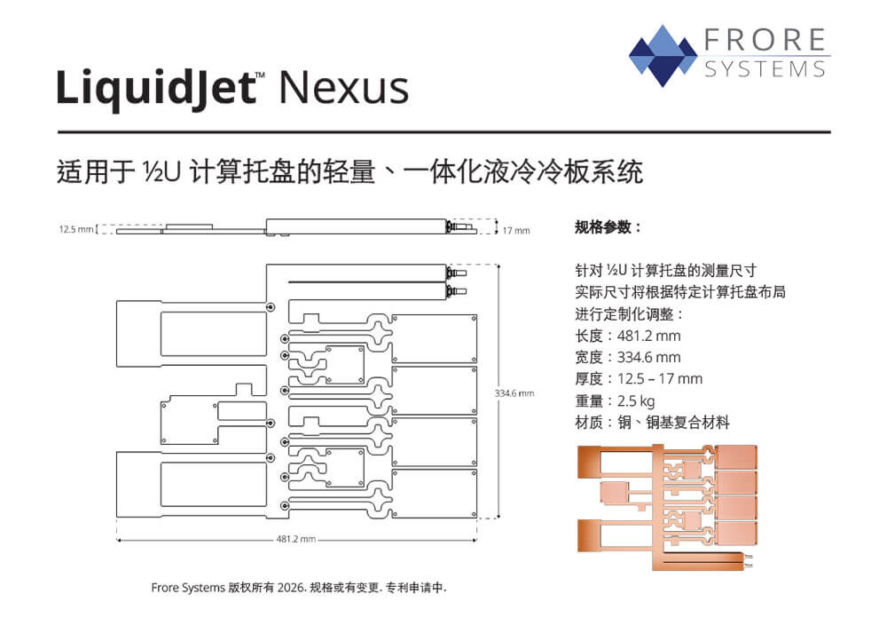 LiquidJet™ Nexus:轻量化一体化冷板系统,通过整合多个 LiquidJet 冷板并取消软管、连接器和歧管,实现 ½U 计算托盘架构