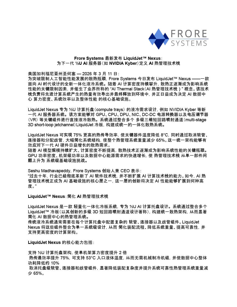 为突破限制人工智能性能发展的散热瓶颈,Frore Systems 今日发布 LiquidJet™ Nexus ——一款面向 AI 时代设计的全新一体化液冷系统。随着 AI 计算密度持续攀升,散热正逐渐成为影响系统性能的关键限制因素,并催生了业界所称的 “AI Thermal Stack(AI 热管理技术栈)” 概念。该技术栈负责将先进计算系统产生的热量有效导出并最终释放到环境中,并正日益成为决定 AI 数据中心 算力密度、系统效率以及整体性能 的核心基础设施。