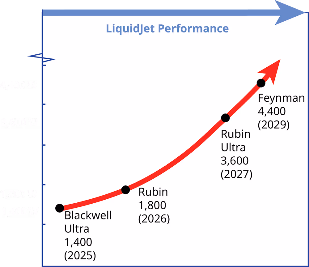 Future-proofed for what’s next, LiquidJet is engineered to scale with next-gen SoCs like NVIDIA Rubin, Rubin Ultra, Feynman (>4,000W) and beyond, as well as for custom hyperscaler ASIC designs. As AI workloads explode, Frore Systems’ LiquidJet architecture is built to keep up.